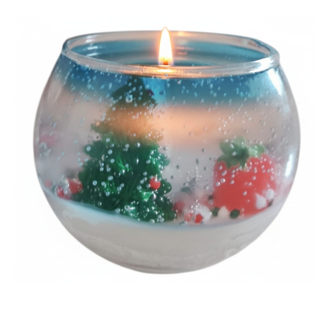 Da la bienvenida a la temporada festiva con nuestra vela decorativa, una pieza central en miniatura que evoca la magia de la Navidad. Esta vela, encapsulada en un encantador recipiente de vidrio, recrea una escena invernal con una capa de nieve blanca y reluciente.