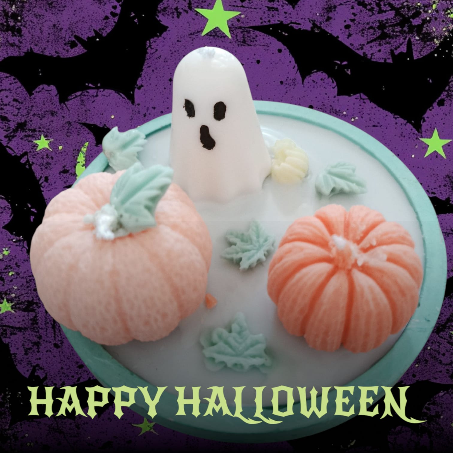 Diseño: Fantasma, calabazas y hojas.