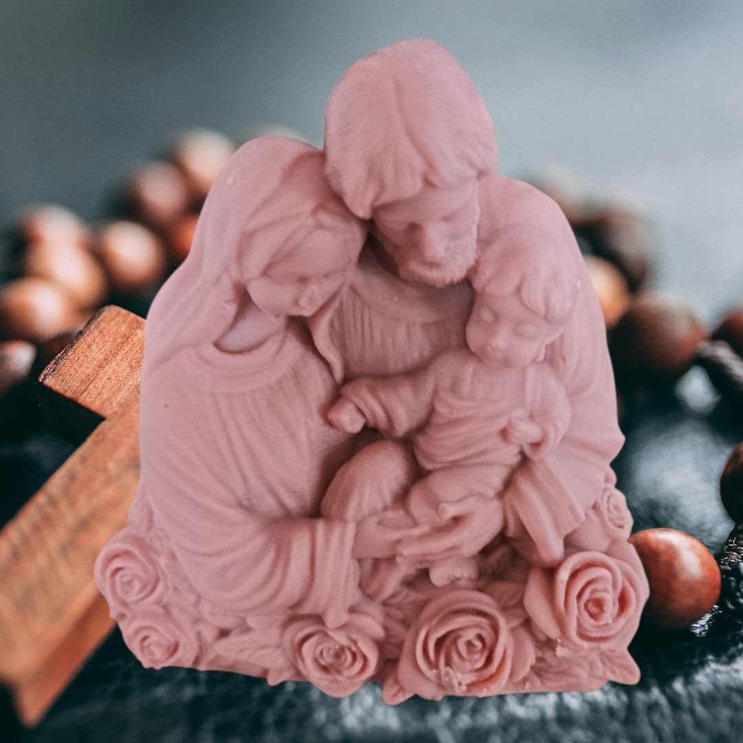 Este hermoso cirio, elaborado con cera de soja es una pieza artesanal única que representa a la Sagrada Familia. Con una altura de 10 cm y un ancho de 8 cm, esta vela captura una escena tierna y protectora, mostrando a José abrazando a María y al niño Jesús.